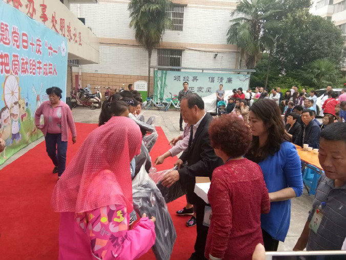汉台区民间文艺家协会主席兼党支部书记王新民在给特殊孩子发放夏凉被