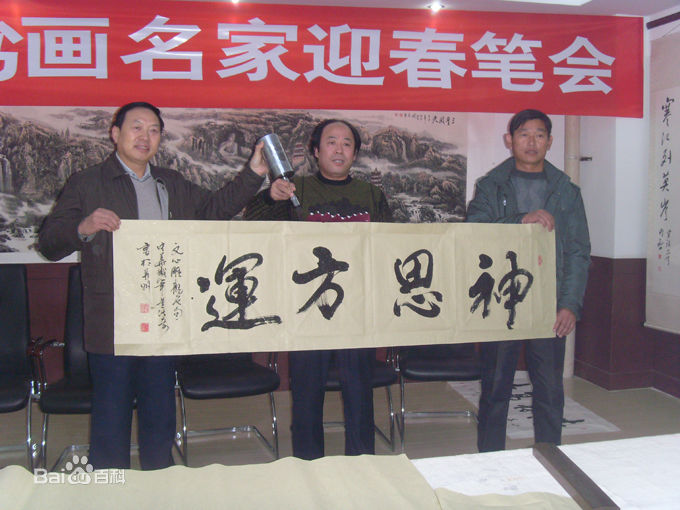 三、运笔。扎稳脚跟,上身前倾,按照脑中计划的章法落笔写字,同时将手臂气力运足,充分发挥灵感,将点按、拉提、扭转、皴甩等技法自如运用,气势若龙飞,形状如凤舞,努力做到举重如轻,进图无我境界,让空灵的感觉创作出精美的作品。整个过程中,运笔如飞、一气呵成。收笔以后,吐出含在胸中之气,再深呼吸,慢慢呼出,去掉铁饼,舒展双臂,收回丹田,卸去气力,平稳气息。最后再去提款、加章。一幅作品成功,一段锻炼的过程也就完成了。