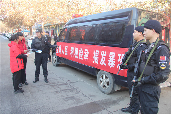 在禹都黄金水岸、禹都市场、空港商业街、星河广场等活动现场,巡逻警车悬挂反恐宣传标语,流动开展反恐普法宣传;巡警队员沿街向群众发放反恐宣传手册,传递反恐防范、自救互救及报警处置反恐知识,对过往群众耐心讲解反恐法实施的意义及重要性;在辖区各公交站牌及人员密集场所同样悬挂反恐宣传标语,扩大反恐普法宣传面;开发区16家二级重点目标单位利用LED屏幕播放反恐宣传标语及悬挂反恐条幅,对一线窗口、岗位工作人员进行反恐宣传教育,切实增强行业从业人员识别、发现、报告、应对能力。