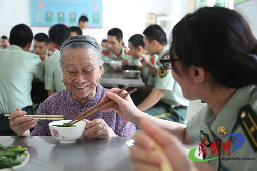 图中“兵女儿”为阿婆夹菜 脸上露出幸福的笑容