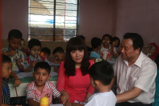 爱心妈妈赵丽萍、玉观音慈善基金姜晋松主任与中缅小学的孩子们进行交流